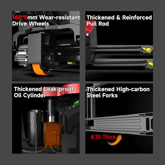 The solid off-road tires glide smoothly over gravel and uneven ground (no more getting stuck like our old standard pallet truck), and the 1200W brushless motor packs enough power to lift full 3-ton loads without straining, while staying surprisingly quiet (way better than the noisy models we used before). The manganese steel frame and thickened forks feel incredibly sturdy—we’ve been using it daily for 2 weeks, and there’s zero sign of warping.